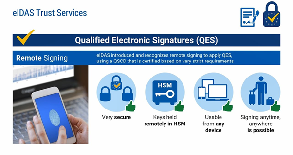 Hiện nay, chỉ có chữ ký điện tử đảm bảo QES cho cá nhân, con dấu điện tử đảm bảo cho tổ chức QSeal cung cấp bởi nhà cung cấp dịch vụ tin cậy đảm bảo QTSP được công nhận trên toàn lãnh thổ EU về hiệu lực pháp lý tương đương chữ ký tay hoặc dấu mộc mà không phải trải qua bất cứ thủ tục đánh giá hay giải trình nào khác. Cơ chế kiểm định và đánh giá công nhận một QTSP được xếp hạng khắt khe bậc nhất châu Âu khi mọi tiêu chí đều yêu cầu phải đáp ứng tuyệt đối.